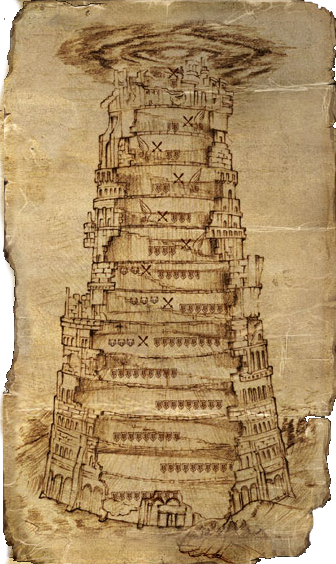 W oddali na horyzoncie widać było wieżę sięgającą po same chmury i znikającą w jej gęstwinie. Była ogromnie szeroka, wysoka a cegły czarne spowite bielmem dając odcienie szarości. Pierwszym co rzucało się w oczy to smugi płynące po tafli wieży niczym wijące się kosmki włosów na tafli wody. Wyglądało to niczym złudzenie, iluzja, a jednocześnie przesiąknięte okrutnie widoczną i realną magią... Wokół wierzy niczym rzędem wiły się spiralnie osadzone okiennice co wyglądało niczym łańcuch wijących się w górę pomieszczeń skrytych za taflą jarzącej się bariery. widoczne jednak po sobie rzędami w górę było tylko 9 okiennic co już pokazywało ogrom wielości wierzy która ujawniała tym samym w całej swej wielkości zaledwie 9 pięter ze wszystkich 13tu. Widać było problemy architektoniczne. Od piątego piętra w górę widać było ogromne jarzące się czerwienią pęknięcia i rysy niczym żyły lawy spływające korytami wulkanu w dół.